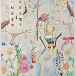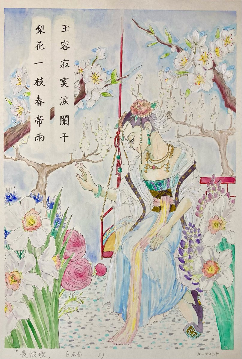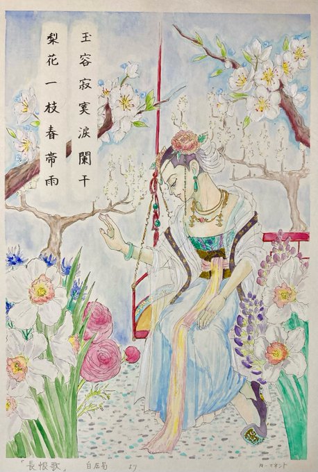 #金カムアナログイラスト部 お題:春爛漫 ブランコに座る宇佐美と梨の花 開催ありがとうございます 漢詩は白居易「長恨歌」より抜粋 「寂しげな涙がこぼれおちる美しいかんばせ まるで春の雨を含むひと枝の梨の花のよう」(雑訳)