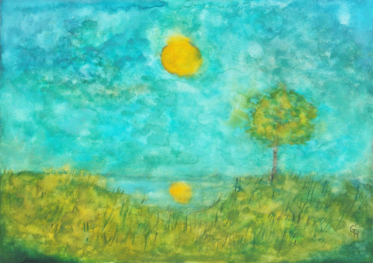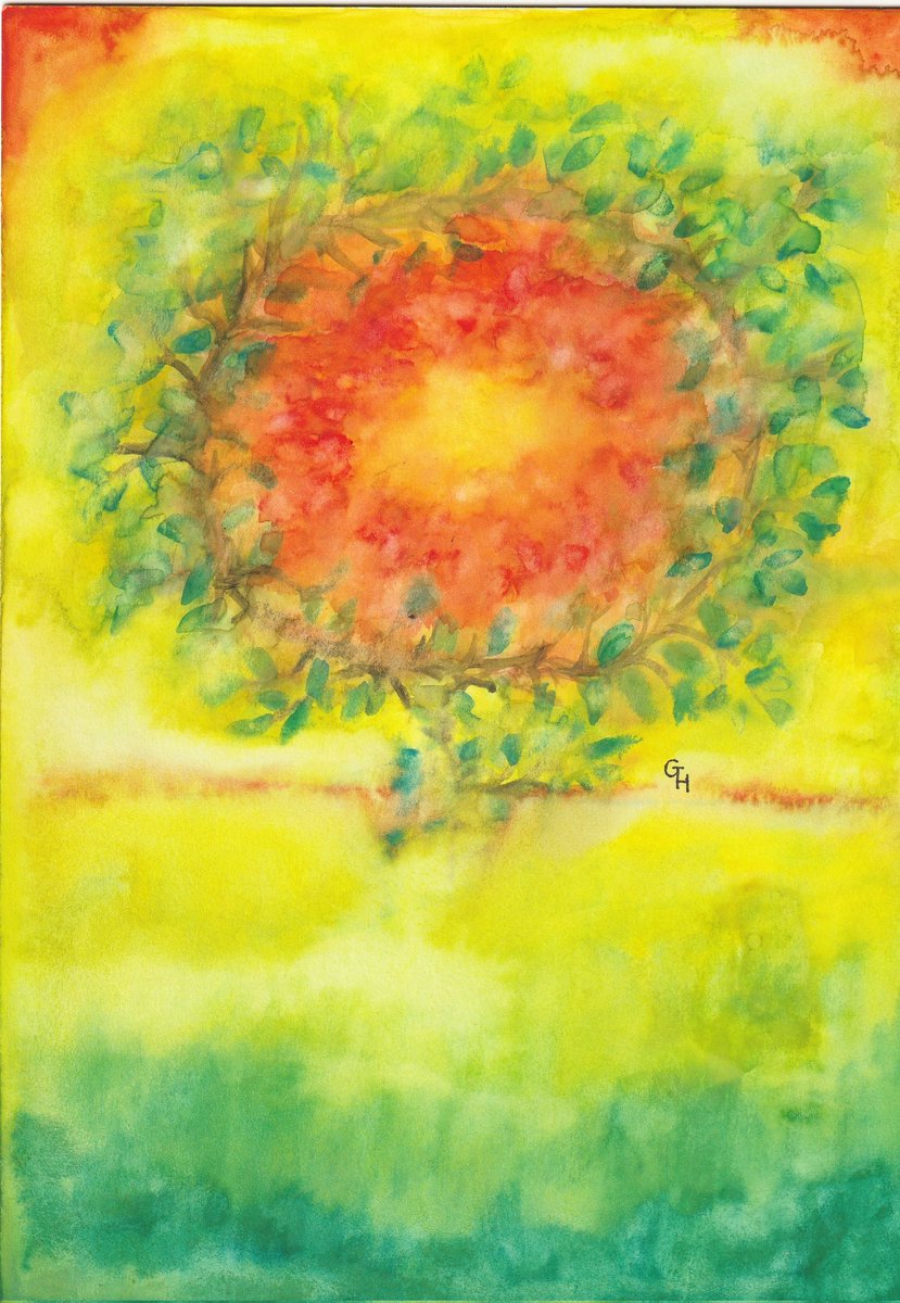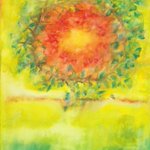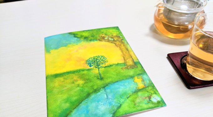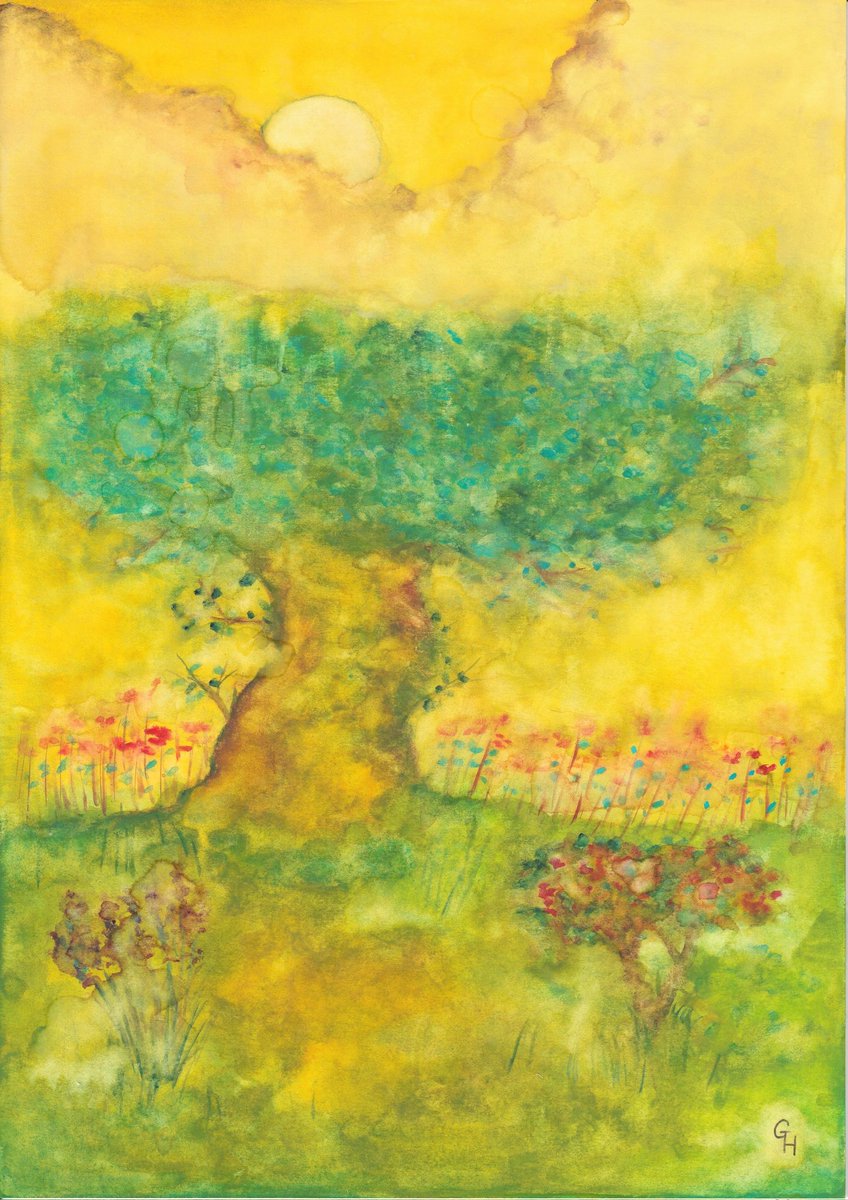 『ガイアの祈り』 無から滲み出る形なき安らぎ、ただ穏やかに風はそよぐ。 今日は公休日です。 昨夜から絵を描いてました。🌼 大きな樹を描くと、心が癒やされます。🍀 #イラスト #イラスト好きな人と繋がりたい #絵描きさんと繋がりたい #アナログイラスト #水彩画