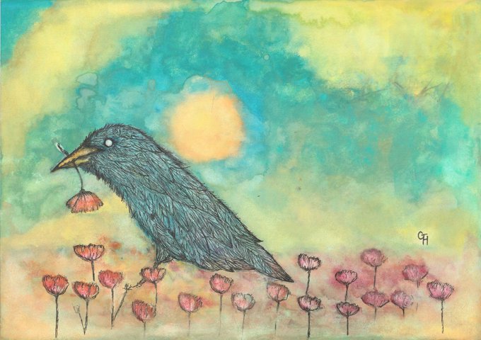 おはようございます。🍀 今日は公休日です。🌸 朝方はまだ肌寒いですね。🍃 イラストは、春の嵐に臨む鳥を描いた水彩画です。 #イラスト #イラスト好きな人と繋がりたい #絵描きさんと繫がりたい #アナログイラスト