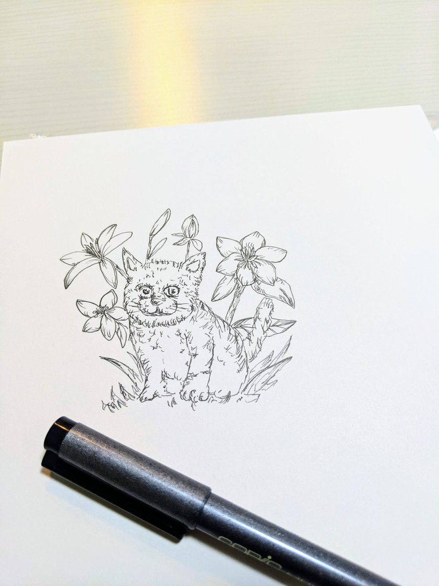部屋の中でNHKの『ひるまえ直送便』を見ていますが、窓の外から雨音が響いております。☔ 今、ペンで描いている猫も、不思議そうな表情…😅 #イラスト #イラスト好きさんと繋がりたい #アナログイラスト #ペン画 #絵描きさんと仲良くなりたい