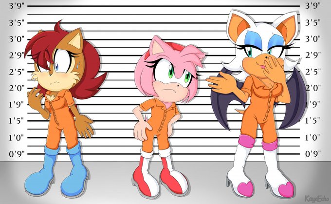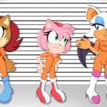 Commission drawn by deviantart.com/kayeecho #sonic #sonicthehedgehog #amyrose #sallyacorn #rougethebat #prison #jail #orangejumpsuit #furryart #furry #art