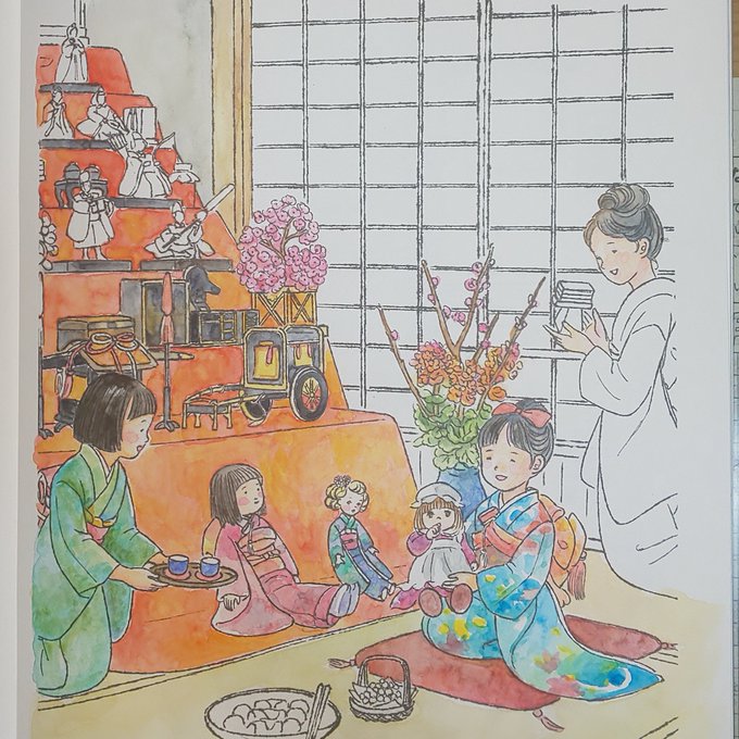 塗り絵完成しました😊ひな祭り🎎に間に合った😉 #大人の塗り絵 #水彩 #ウインザー&ニュートン #水彩色鉛筆 #アナログ