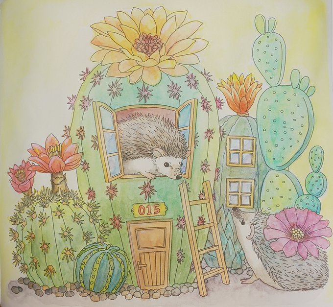 6 84 塗り絵しました😆サボテン🌵とハリネズミさん。 #大人の塗り絵 #水彩 #アナログ 23/03/06 17:24