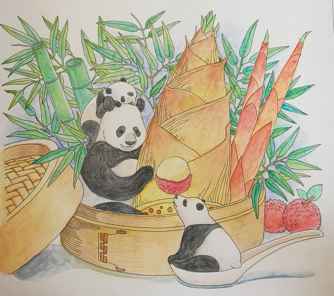 4 78 塗り絵しました😃パンダちゃん🐼とライチと筍。 #大人の塗り絵 #水彩 #アナログ 23/03/09 17:24