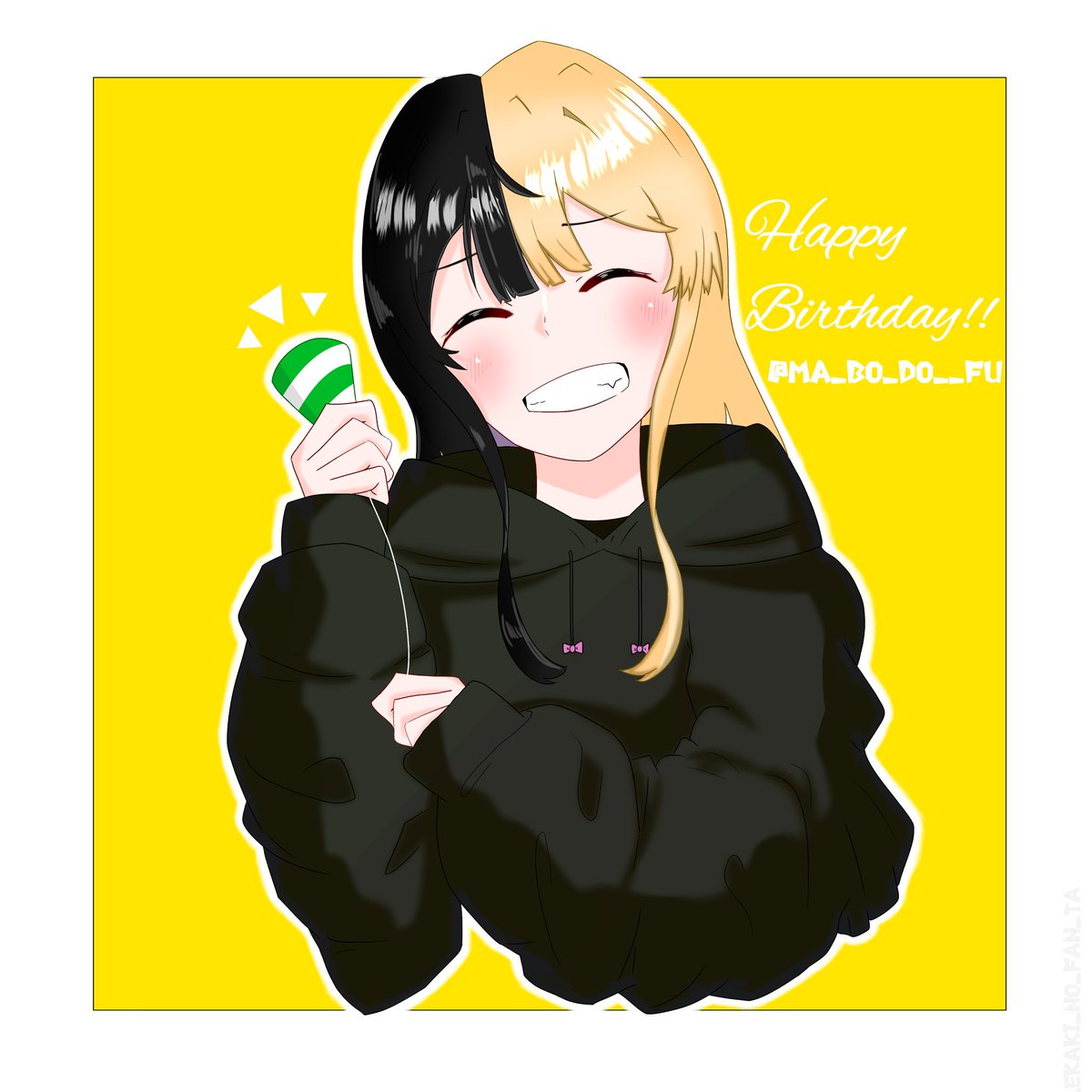 🖤#まぼ絵365日チャレンジ💛 132日目:まぼ誕生日🎉🎊 まぼちゃん【 @MA_BO_DO__FU 】誕生日おめでとうございます!! いつも最高にカッコ良くて可愛い歌と配信が大好きです!!🖤💛 これからもずっと応援しています! いい一年にしてください!😆 ※リプ欄に今まで描いたまぼ絵達も👀↓ #まぼ絵