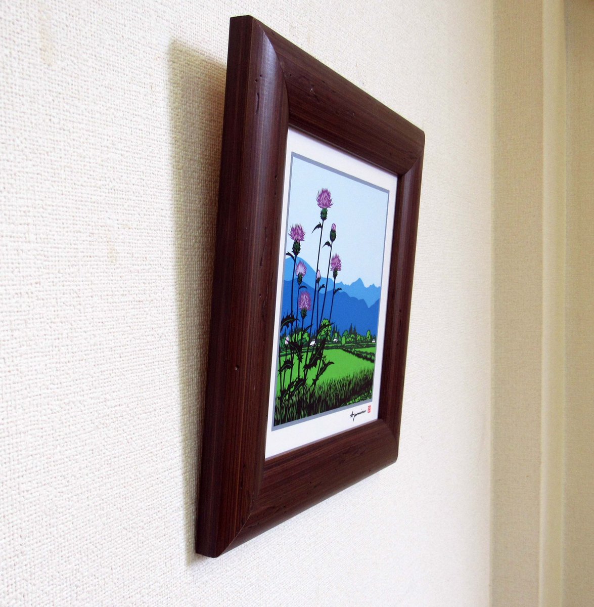 タイルアートのご紹介です。 「WA-21 安曇野・アザミ咲く」 常念岳はすでに夏山、登山者もたくさん入っています。 安曇野に広がる田園のあぜ道に腰を降ろせば、隣には野アザミが背を伸ばし、稲を揺らす涼しい風が吹き渡ります。#北アルプス #安曇野 #野アザミ #登山 #風景画 #切り絵 #常念岳 #田園