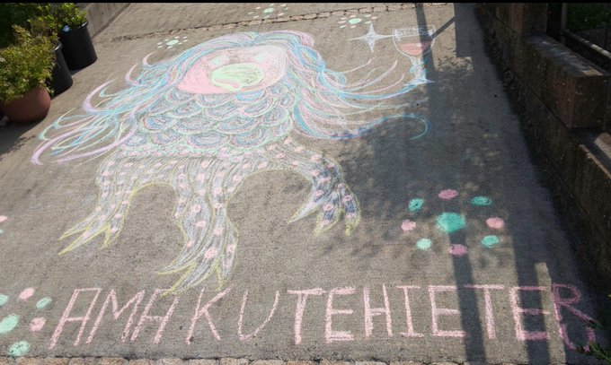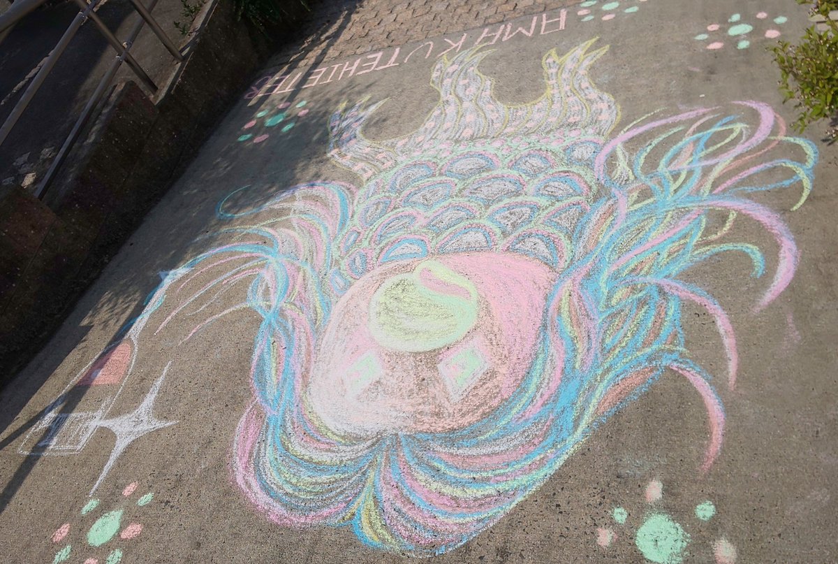 今日は突然思い立って、家族でアマビエのチョークアートを描きました。 想像以上の難しいさ。 それ以上に想像以上の暑さ。 早くコロナ禍がおさまりますように…。 #アマビエ #甘くて冷えてる