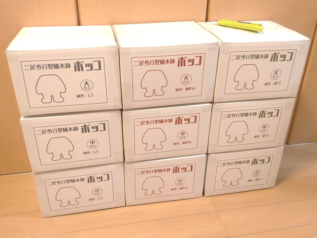 これがポッコの3サイズ×3カラーと箱。サイズ違いでも同じ箱ですね。 #二足歩行型植木鉢