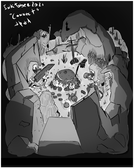 "Rarely, between two hunts, the Looters met to exchange, eat or rest in safety" Inktober 2021 26/10/21 "Connect" #art #illustration #drawing #inktober2021 #inktober2019