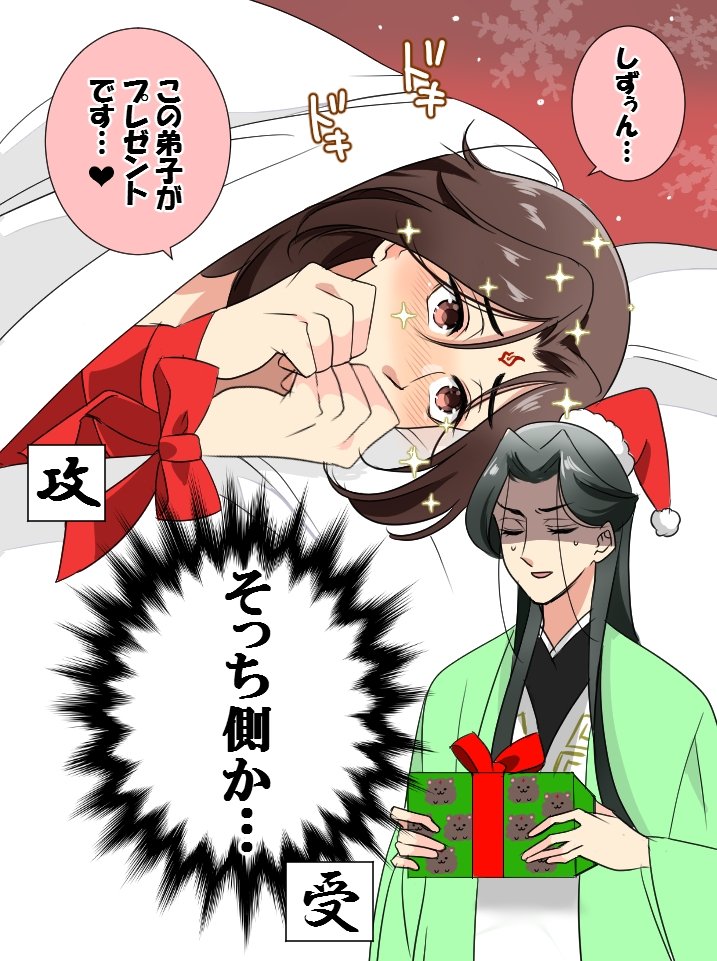 お題箱よりリクエスト頂きました『自分をプレゼント仕様にして師尊を待ってる冰ちゃん(冰秋)』を描きました!ギリギリクリスマスに間に合ったけどこれは…冰秋…??すみませんリクエストありがとうございました!!🙇♀🙇♀