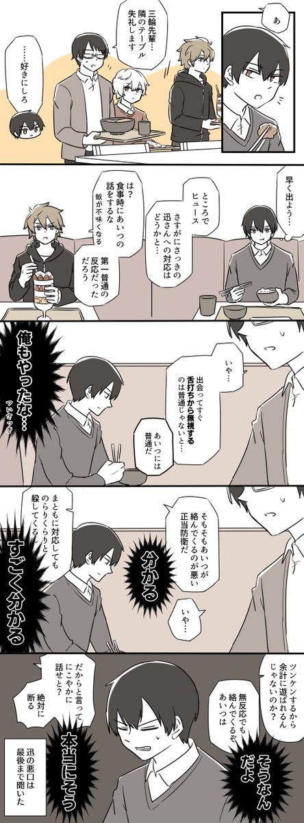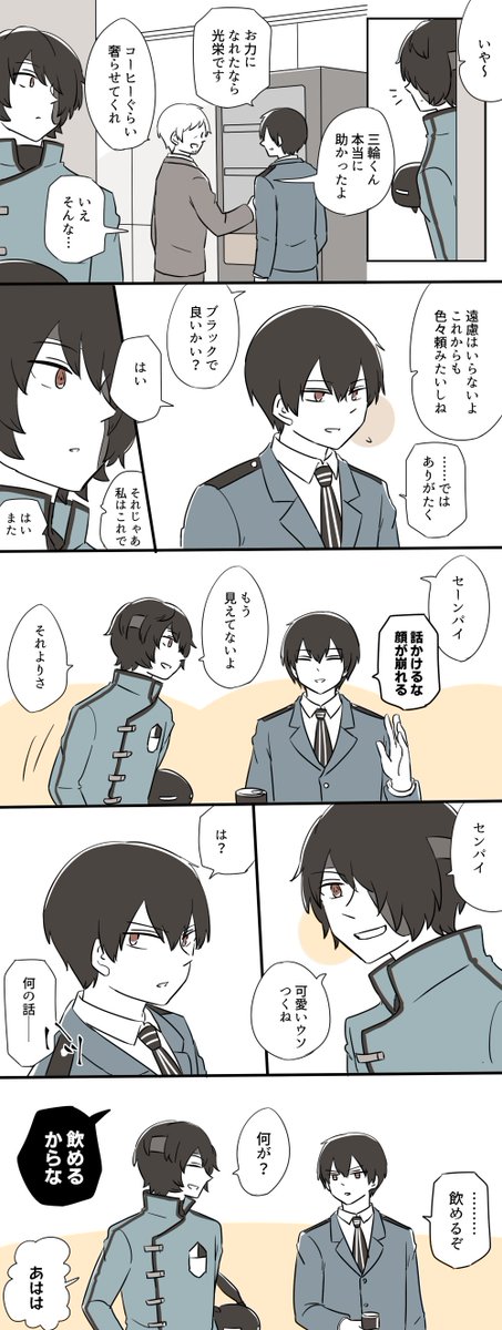 429 3170 分かりみ ※三輪+ヒュース ※迅さん好きちょっと注意かも リクボより「迅さんの事が気に食わなくて意外と話が合う三輪くんとヒュースくん」です! 話が合うというかなんかアレですがありがとうございました~! 23/03/01 21:59
