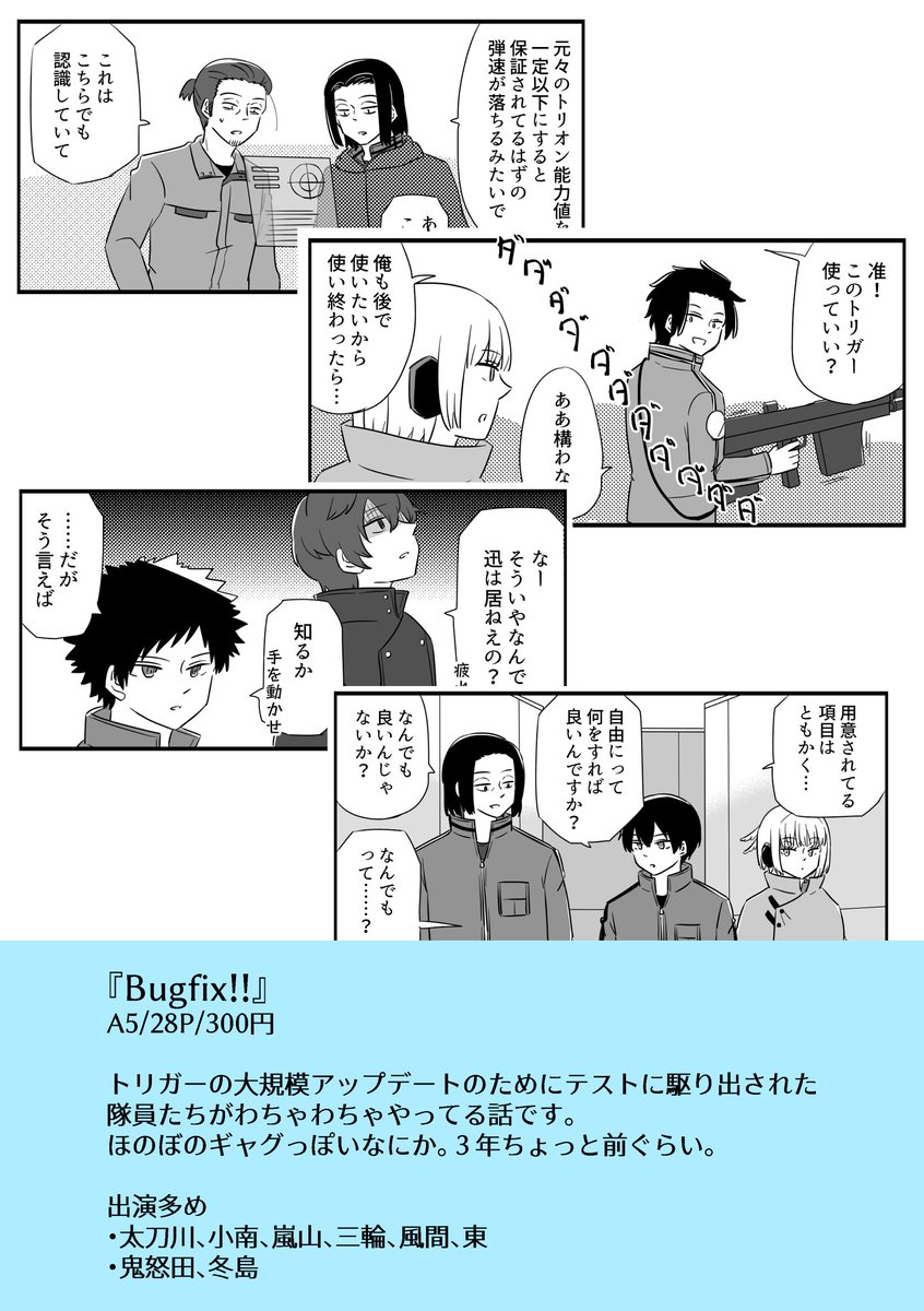 2023/5/4 超吾が手2023 発行予定の新刊サンプルです! 『Bugfix!!』 A5/28P/300円 初期ボダ面子が開発室に頼まれてトリガーのテストしながらわちゃわちゃする話です。おおよそほのぼの よろしくお願いします!!