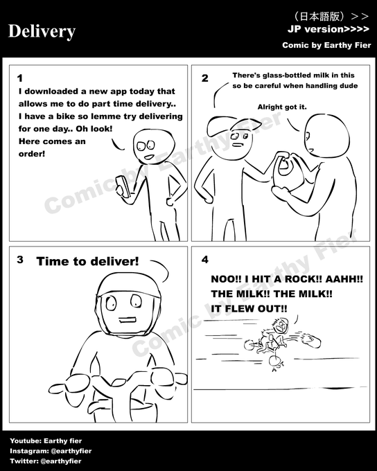 instagram.com/earthyfier/ ^See more 日本語付きの漫画 A bilingual comic EP 354 Delivery 配達 #イラスト #絵描きさんと繋がりたい #みんなで楽しむTwitter展覧会 #漫画が読めるハッシュタグ #4コマ漫画 #comic #一次コミ #Twitter交流会会場 #4コマR $picrt #落書向上委員会