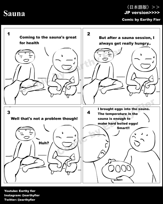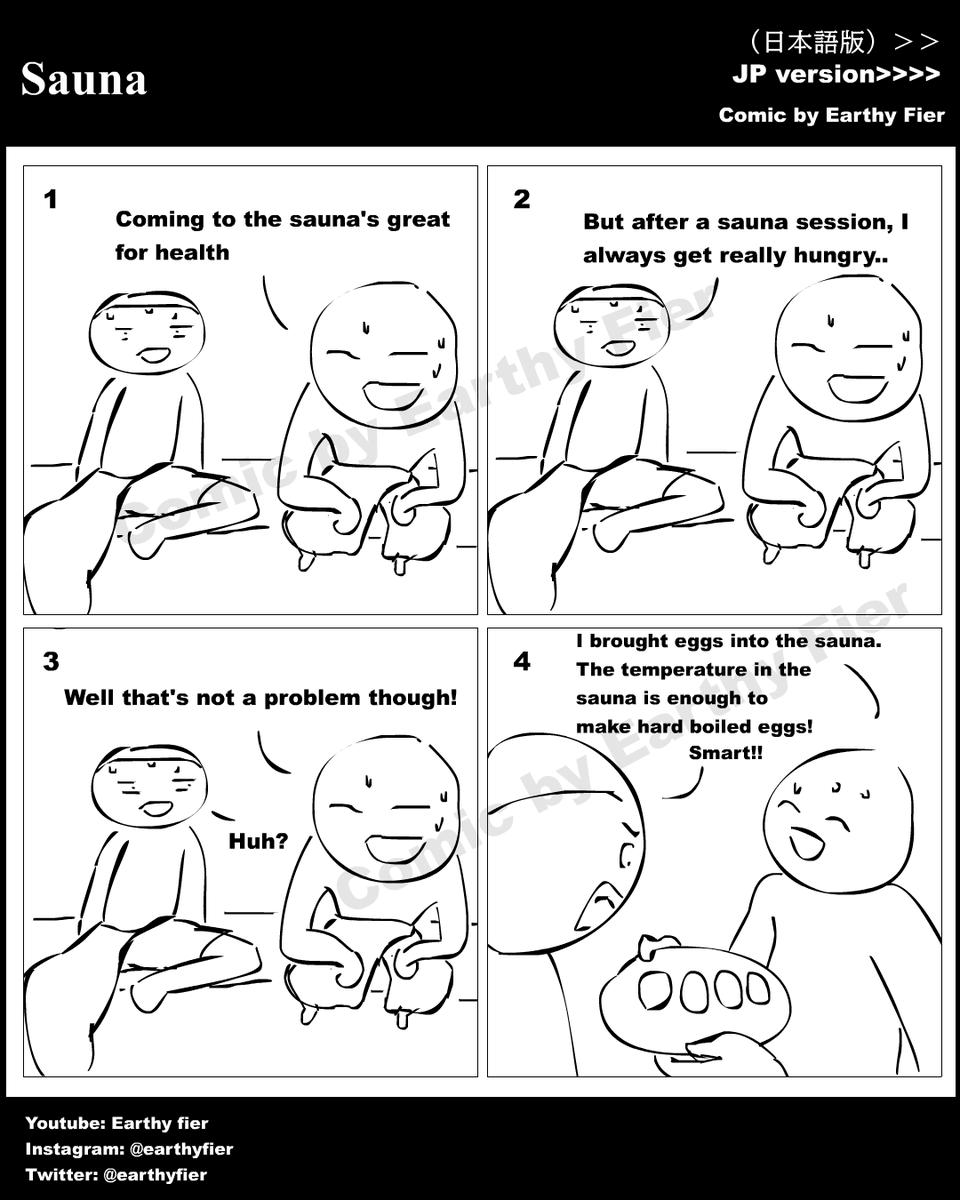 instagram.com/earthyfier/ ^See more 日本語付きの漫画 A bilingual comic EP 348 Sauna サウナ #イラスト #絵描きさんと繋がりたい #みんなで楽しむTwitter展覧会 #漫画が読めるハッシュタグ #4コマ漫画 #comic #一次コミ #Twitter交流会会場 #4コマR $picrt #落書向上委員会