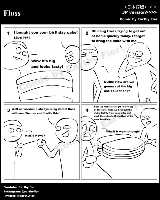 instagram.com/earthyfier/ ^See more 日本語付きの漫画 A bilingual comic EP 351 Floss フロス(糸ようじ) #イラスト #絵描きさんと繋がりたい #みんなで楽しむTwitter展覧会 #漫画が読めるハッシュタグ #4コマ漫画 #comic #一次コミ #Twitter交流会会場 #4コマR $picrt #落書向上委員会