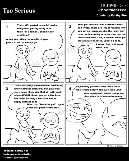 instagram.com/earthyfier/ ^See more 日本語付きの漫画 A bilingual comic EP 357 Too Serious 真面目すぎる #イラスト #絵描きさんと繋がりたい #みんなで楽しむTwitter展覧会 #漫画が読めるハッシュタグ #4コマ漫画 #comic #一次コミ #Twitter交流会会場 #4コマR $picrt #落書向上委員会