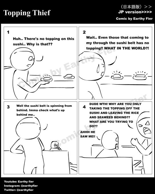 instagram.com/earthyfier/ ^See more 日本語付きの漫画 A bilingual comic EP 360 Topping Thief ネタ泥棒 #イラスト #絵描きさんと繋がりたい #みんなで楽しむTwitter展覧会 #漫画が読めるハッシュタグ #4コマ漫画 #comic #一次コミ #Twitter交流会会場 #4コマR $picrt #落書向上委員会