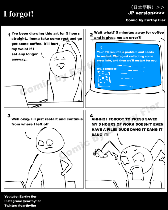 instagram.com/earthyfier/ ^See more 日本語付きの漫画 A bilingual comic EP 364 I forgot! 忘れた! #イラスト #絵描きさんと繋がりたい #みんなで楽しむTwitter展覧会 #漫画が読めるハッシュタグ #4コマ漫画 #comic #一次コミ #Twitter交流会会場 #4コマR $picrt #落書向上委員会