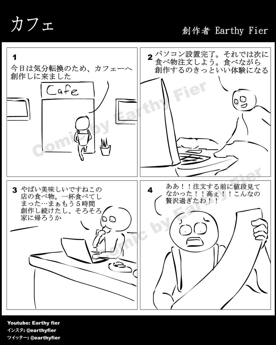 instagram.com/earthyfier/ ^See more 日本語付きの漫画 A bilingual comic EP 366 Cafe カフェ #イラスト #絵描きさんと繋がりたい #みんなで楽しむTwitter展覧会 #漫画が読めるハッシュタグ #4コマ漫画 #comic #一次コミ #Twitter交流会会場 #4コマR $picrt #落書向上委員会