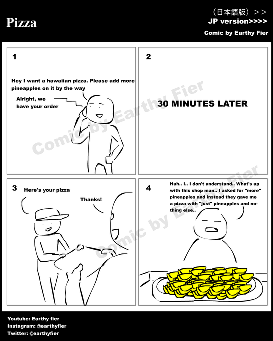 instagram.com/earthyfier/ ^See more 日本語付きの漫画 Multilingual comic EP 464 Pizza ピザ #イラスト #絵描きさんと繋がりたい #みんなで楽しむTwitter展覧会 #漫画が読めるハッシュタグ #4コマ漫画 #comic #一次コミ #Twitter交流会会場 $picrt #落書向上委員会