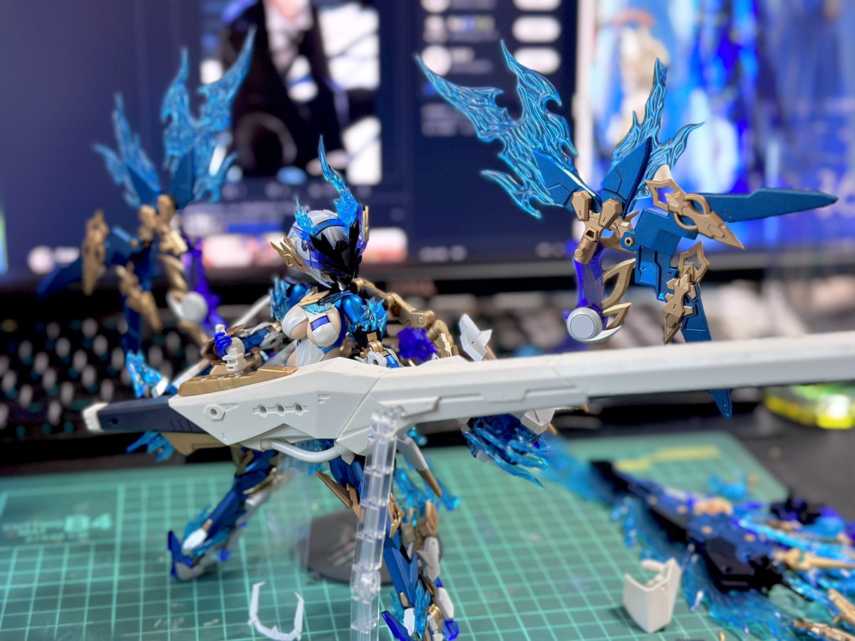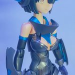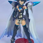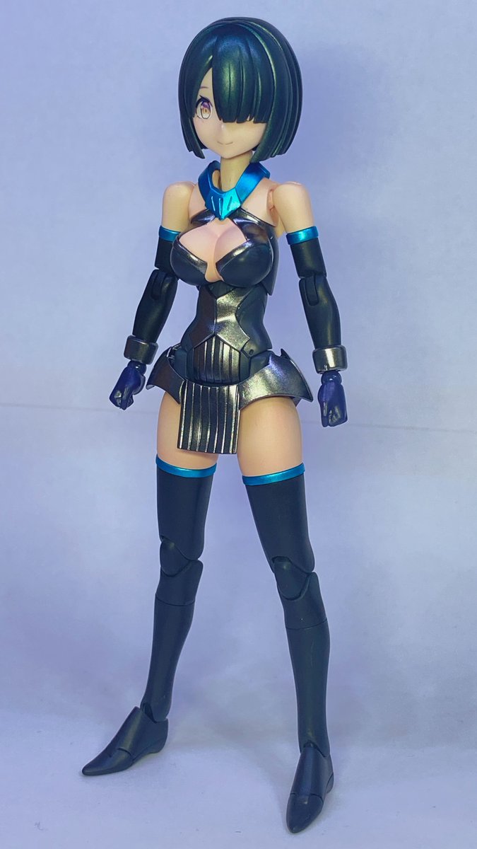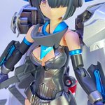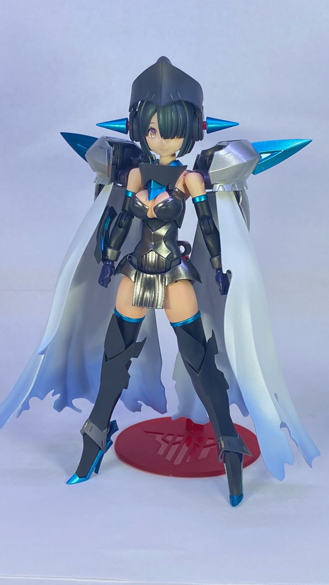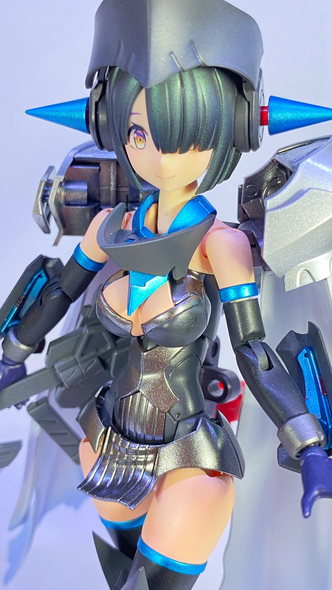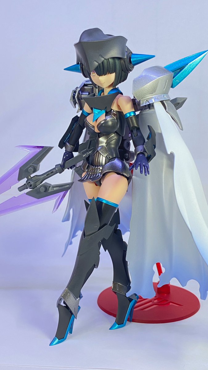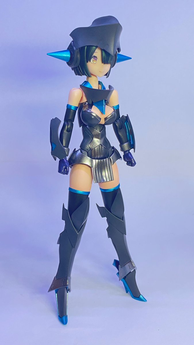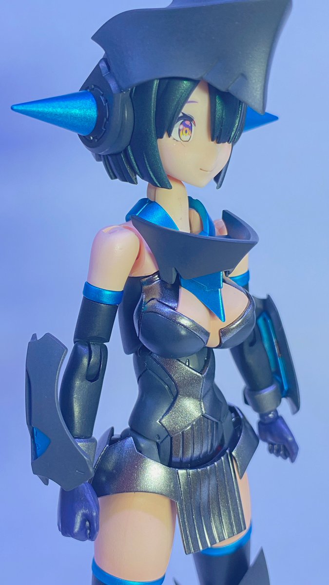 素体と軽装備状態で 布地っぽい所は艶消し黒にして装甲系をグレー、厚みのある場所はガンメタ。 クリアレットのパーツを差し色として青のキャンディ塗装に変更。 ルミティアほどマスキングや手のかかる塗装法は多くなかったので塗装も早めに片付きました。 #メガミデバイス #エクスキューショナー