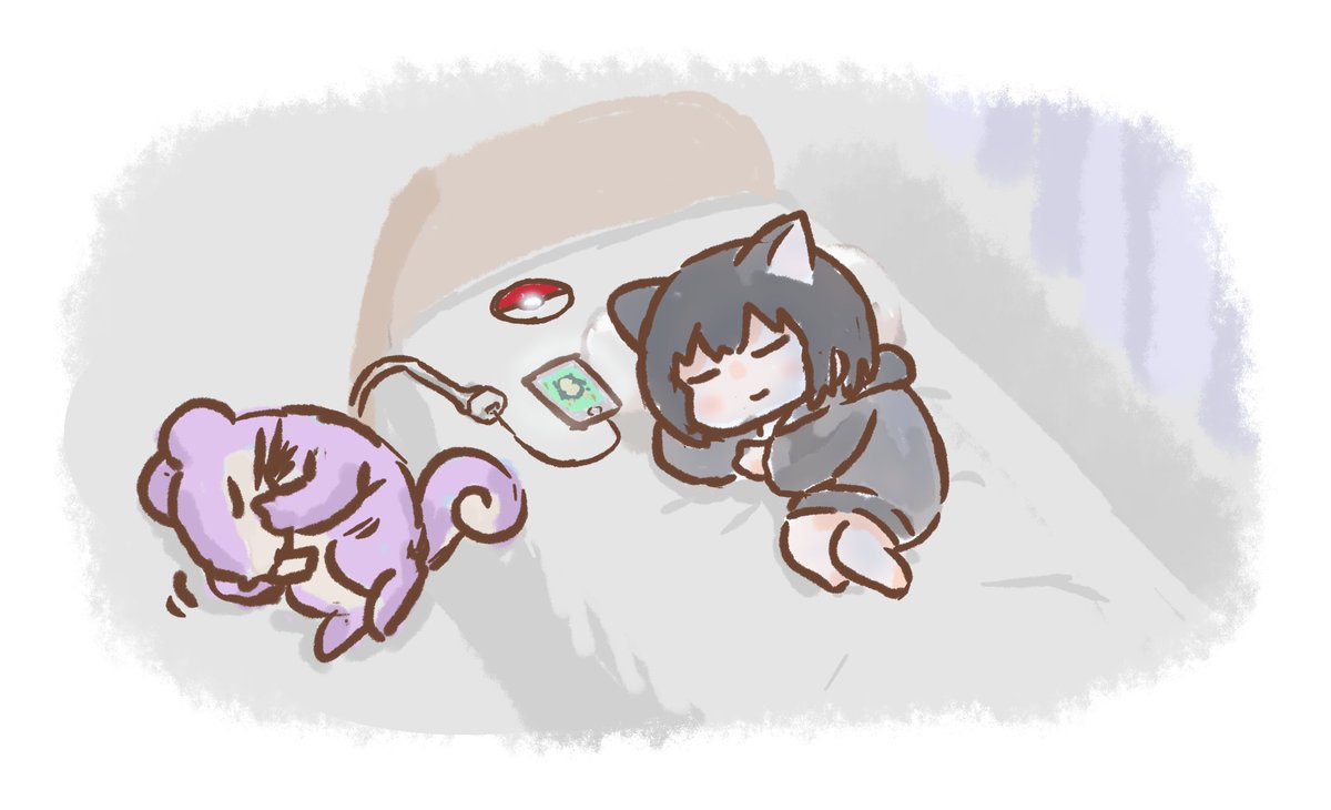 【イラストリクエスト】 ウンフェルスさん 📕 「ポケモンスリープを起動して、ベッドで熟睡しているウンフェルスのイラスト。枕元にポケモンGo Plus+あり。」 リクエストありがとうございました😼