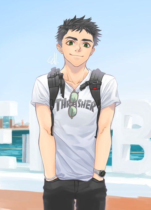 5 23 川航くんと中島さんに現代の服を着せたくて、描いてしまいました🤗 背景才能0でまじでごめんなさいね…。びこべの雰囲気だけ感じてください。夏っぽい背景にしたかったんです😇 #にりんぎ二次創作 #現パロ 21/06/22 03:28