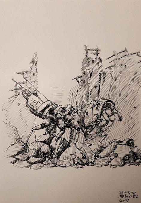 Second #Inktober #drawing . Heavy hardsuit for exploring hazardous areas for long periods without support. Scurrying along bombed out streets. #inktober2022day2 #penandink #inktober2022scurry