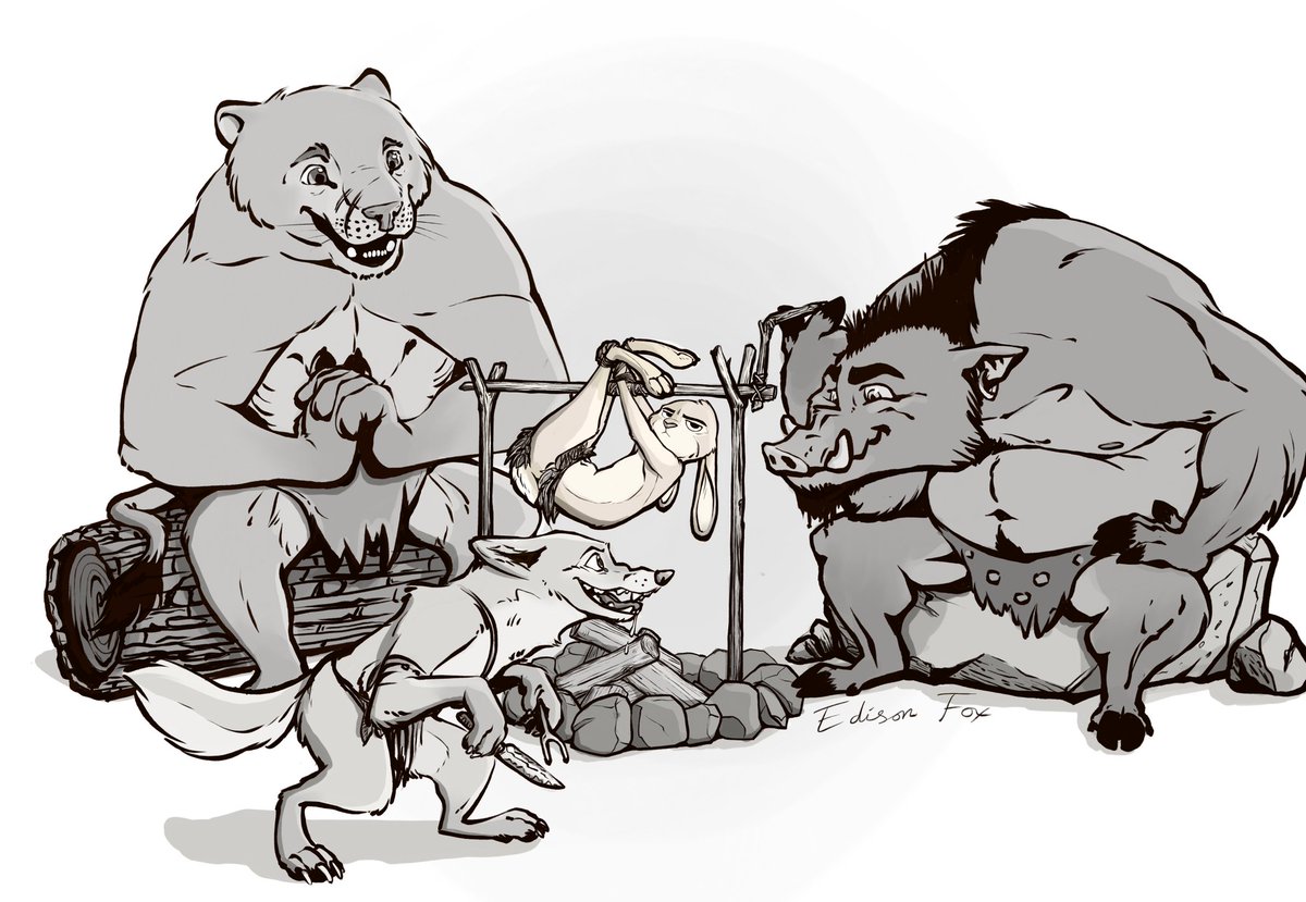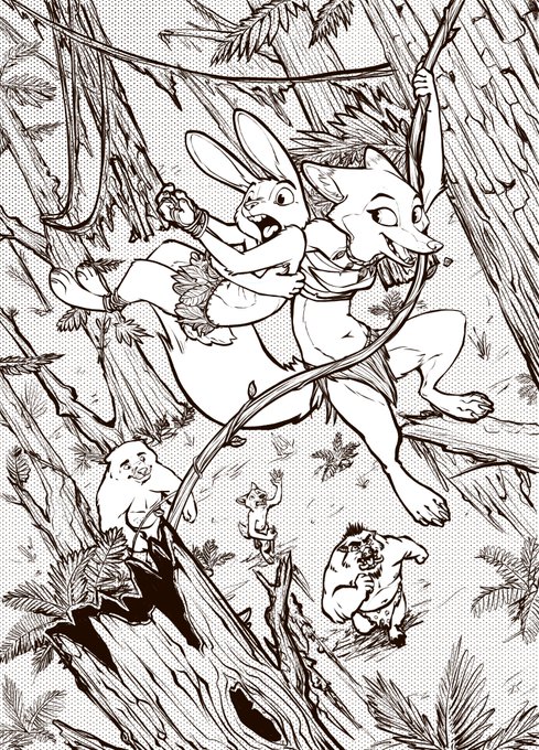 Here's the completed full panel! No color yet, but eventually! #ink #Scuppie #bunny #vixen #fox #boar #wolf #cavelion #lion #swing #vine #furry #cute #furryart #zootopia #paleolithic #neolithic #prehistoric #inking #inktober2019 #Zinktober2019 #inktoberday30 #catch