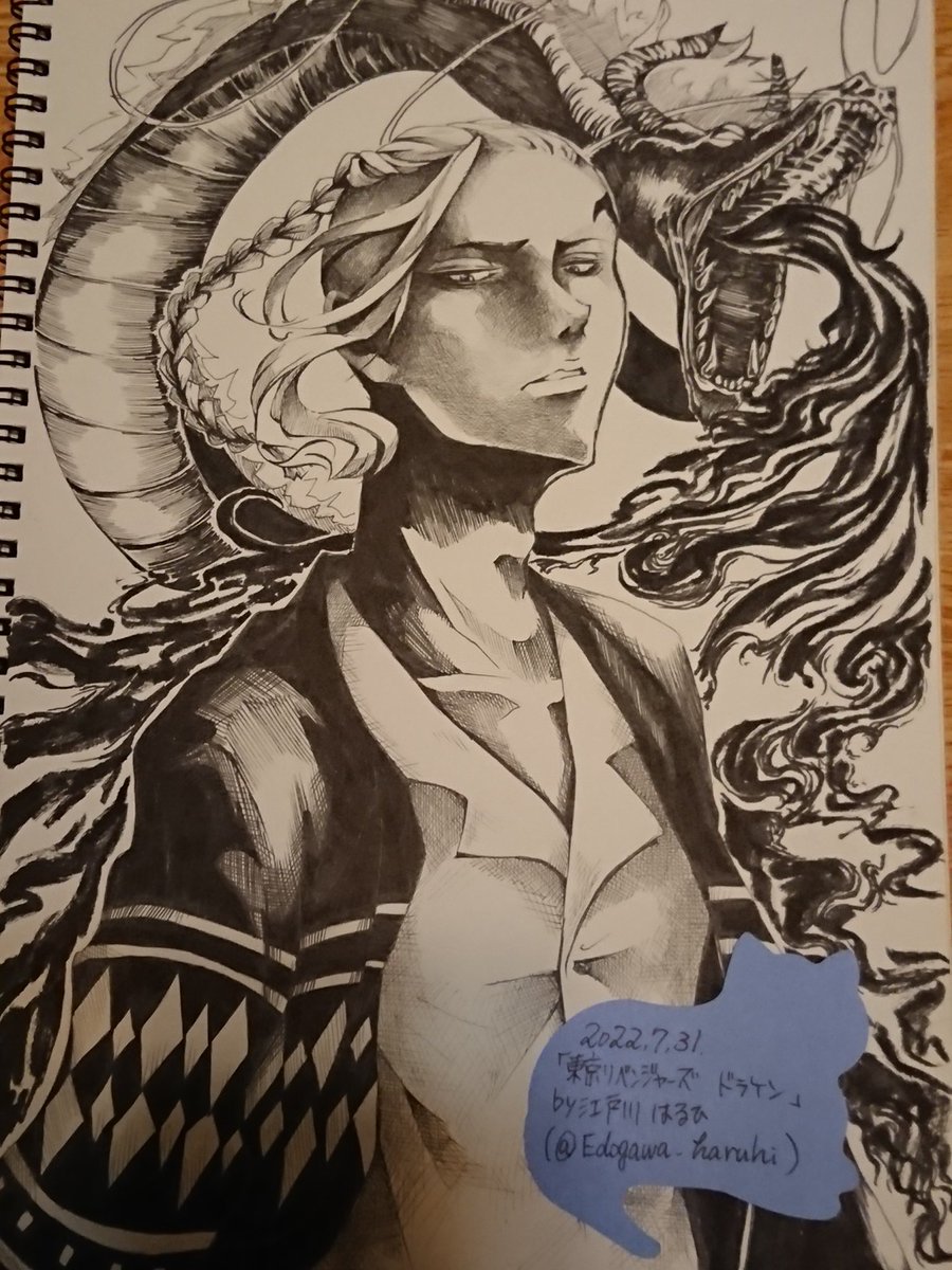 20 166 出来ました👓✨ 原作未読なので、細かいとこ違ったりするかもですが、ご容赦の程を🙇💦 #東京卍リベンジャーズ #ドラケン #ペン画 22/07/31 22:02