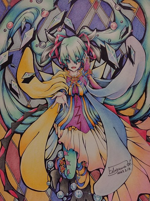 33 185 ミクちゃん完成しました👓✨ なんだか色が飛び散った感じあるなぁ🤔次回の課題だぬ! #初音ミク #色鉛筆イラスト 23/03/13 22:35