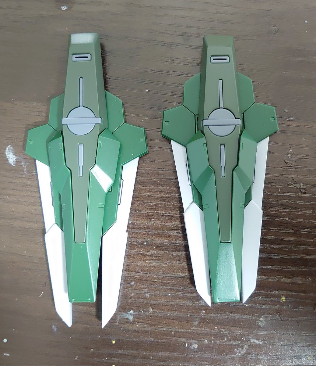 4 44 多分今年最後のガンプラ制作ツイート デュナメスの新しいシールド、ライフルビットの位置はどっちがいいかな? #ガンプラ 22/12/28 21:37