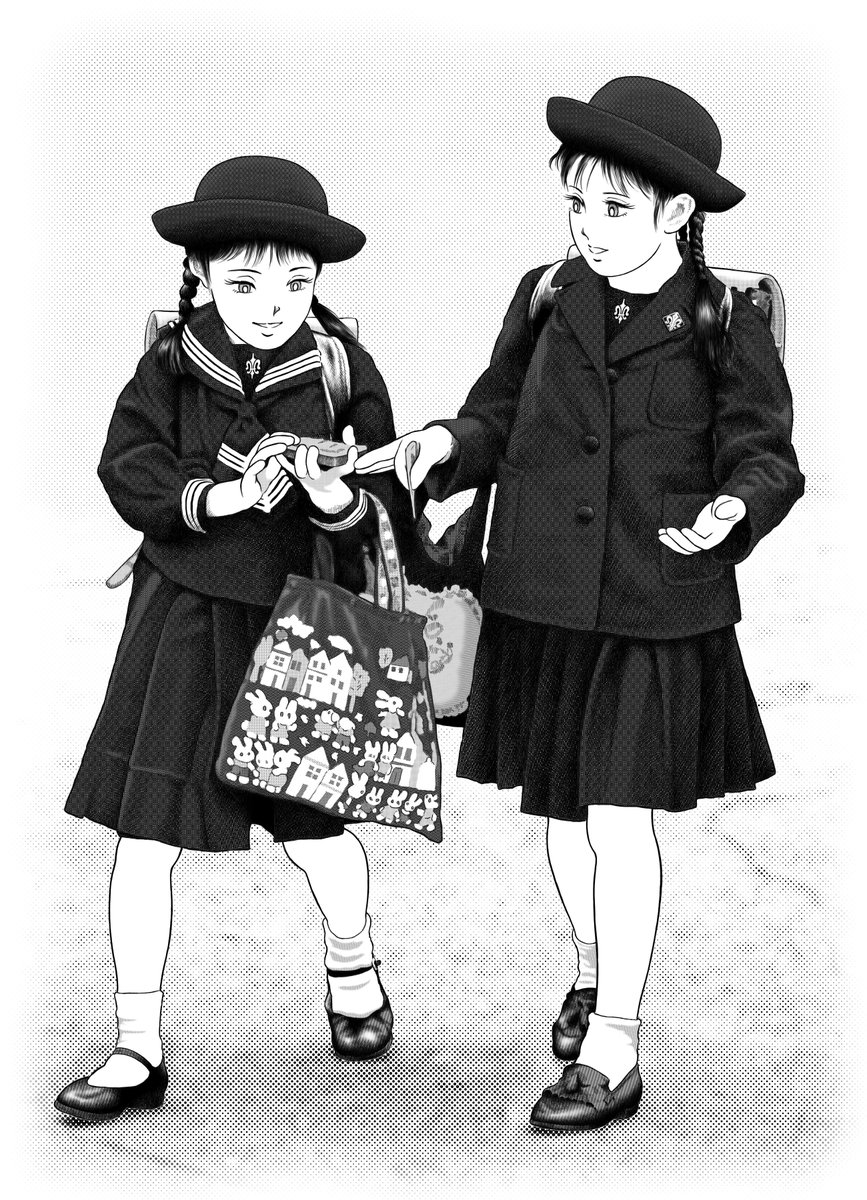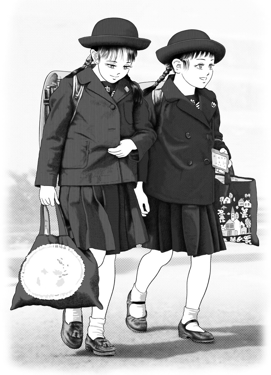 湘南白百合学園小学校(藤沢市) 昭和も終りに近い藤沢駅前にて。おそらく姉妹であろう、いつも一緒の二人。これまで一貫して複数が写った写真からでも一人ひとりを別けて描くようにしてきたが、これは絵的に切り離せないと思い初の二人同時描きとなった。 #イラスト #制服 #365日の絵理歌