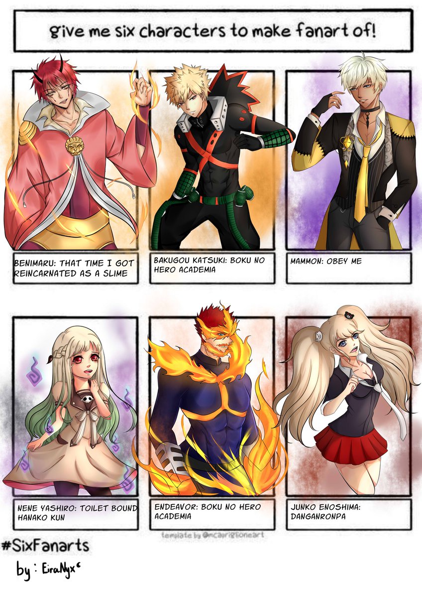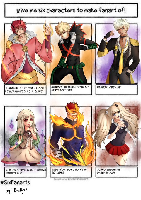 I'm so late finishing this but anyways Its actually rushed I'll just cry in the corner and question my existence (╥﹏╥) #sixfanarts #sixfanartschallenge #thattimeigotreincarnatedasaslime #bokunoheroacademia #obeyme #toiletboundhanakokun #danganronpa