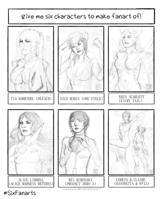 Traditional SixFANARTS Decided to do this #SixFanarts #SixFanartsChallenge with: #tiaharribel #bleach #nicorobin #onepiece #erzascarlet #FairyTail #aliceliddell #alicemadnessreturns #reikurosawa #projectzero 3 #cereza #bayonetta #clairefarron #lightning #finalfantasyXIII