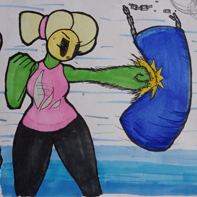Stela training Besides she trains a lot with the boxing bag, she always was very strong. So strong that she lifted up her husband car like it was a pillow. 🔁 and ❤️ are very appreciated 😃 #oc #ArtistOnTwitter #plantas #characterdesign #flower #strongwomen
