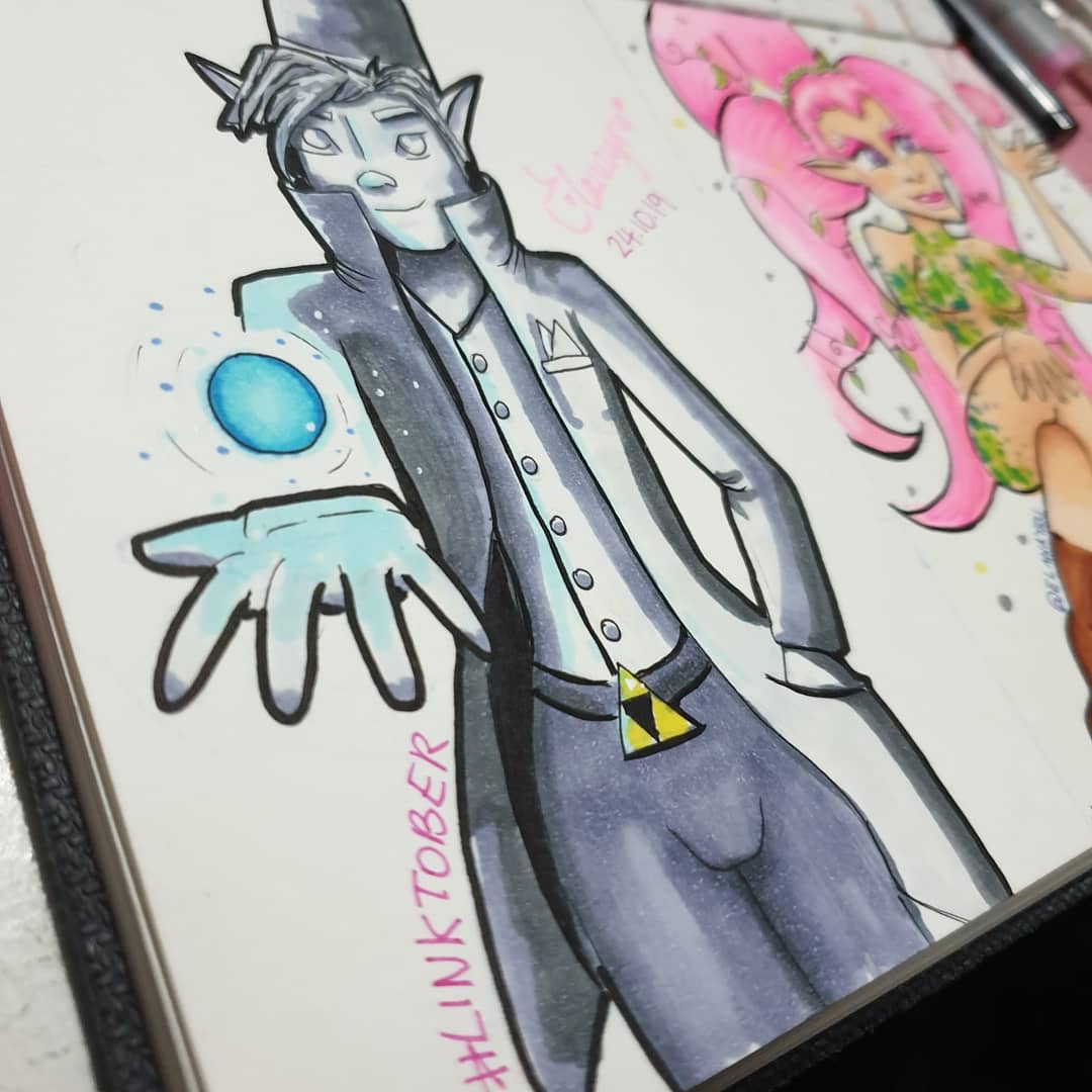 Day 24 • Redesign Link's Outfit See.. this was hard because I love what Link wears. So I saw some.steampunk long coats and was like 😍😍 It was late so just stuck to greys. Oh and then a different take to Navi 😊 #linktober #inktober2019 #legendofzelda #loz
