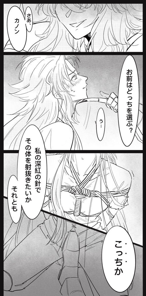 カノ→→→ミロのつもりでしたが似てなくてごめんなさい🙇♀️ カノンはMな部分があると思いますけどうまく隠されてで誰も気付いていない(もしかして自分も)と思います。以前ミロの慈悲深い(笑)毒針に刺されたことがあって、その後も心底まだ刺されたいと思ってるかもな~と思い描きました