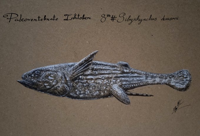 Sibyrhynchus denisoni, is in my subjective opinion one of the most remarkable Iniopterygiformes, but other ones could be in this position. Notice the lower jaw prognathism, althought is far to be exclusive, is unusual among Gnatostomata. #paleoart #paleovertebrateinktober