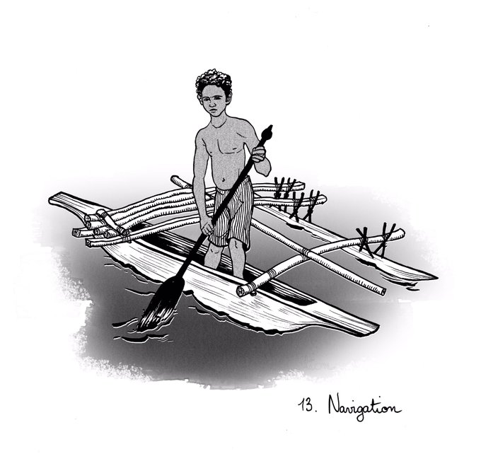 Jour 13 : navigation Dessin d’après la photo d’un jeune garçon naviguant près de la côte entre Sépik et Madang, Papouasie-Nouvelle-Guinée, mai 1955. Photographie par Françoise Girard, tirage sur papier baryté conservé au @quaibranly à Paris. #Pacifinktober #inktober