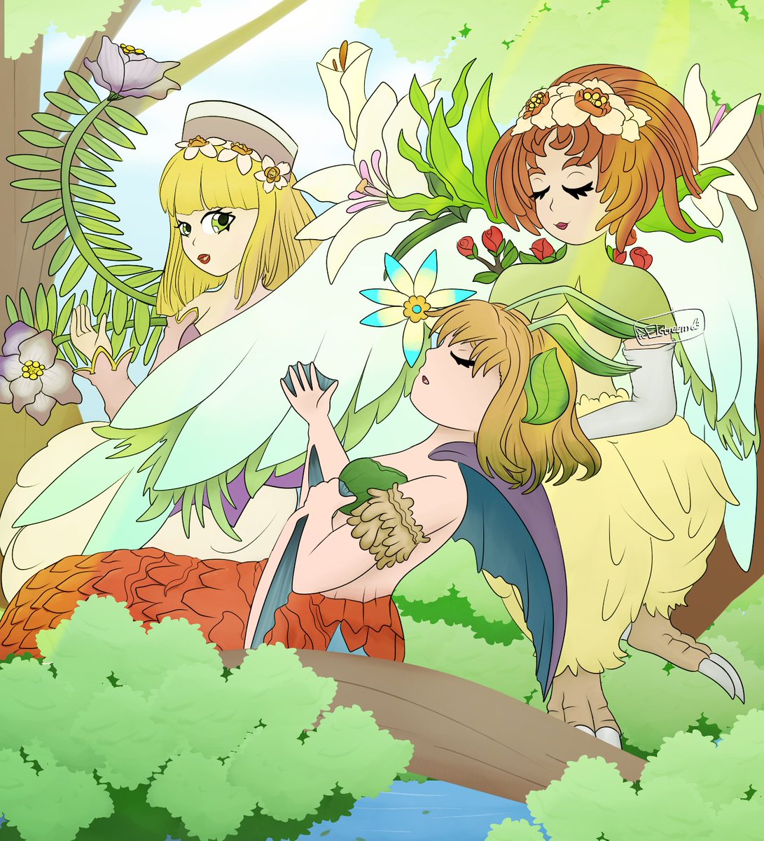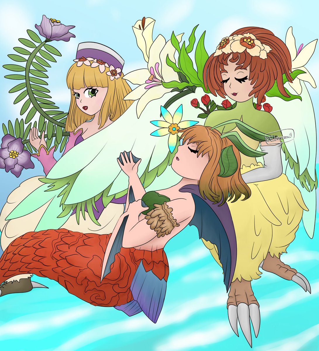 This monster is finally done...Elle, Monique and Flameshe from #LegendofMana ! Flameshe makes for my 9th videogame mermaid fanart for #Mermay. I did two versions because man am I bad at deciding backgrounds. Which one looks better? #fanart