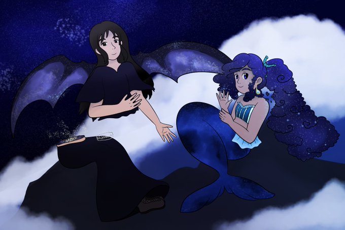 OC art! One last mermaid with Raine for #mermay, and even throwing in another OC, Destiny, for #Maynananggal . You know I have no more ideas on what to use for background when I just go for night skies everywhere.