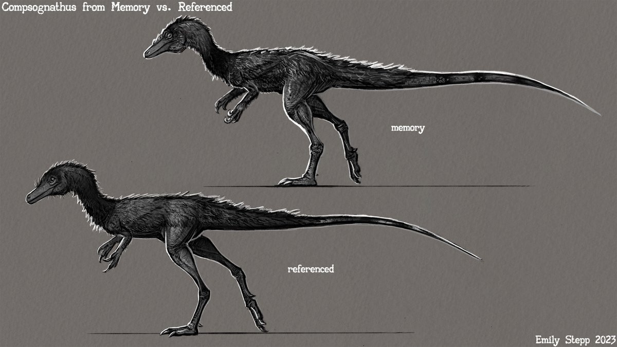 26 166 Compsognathus paleoart sketch from memory vs. reference. 23/08/02 05:09