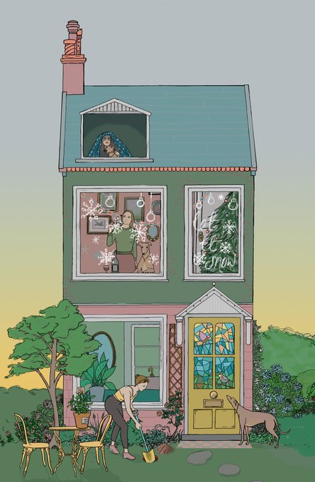 Revisited this stacked timeline of lockdowns for a promo. I like the tightening of the composition with the human and dog characters brought in front of the house. #illustrationart