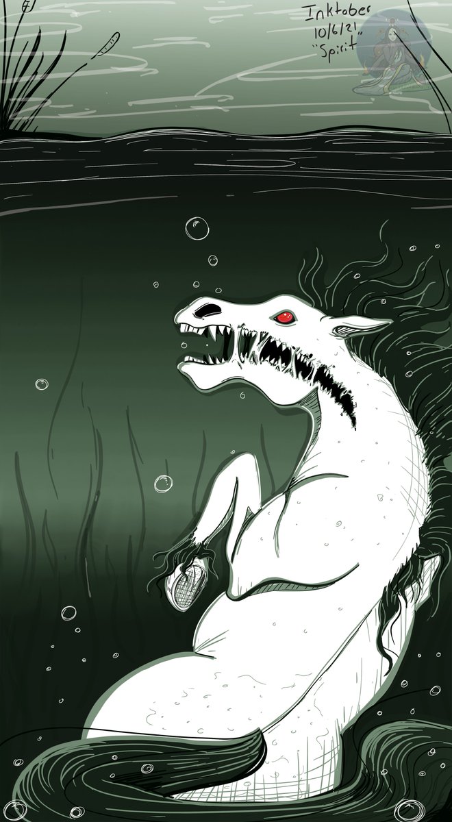 10/6/21 : So for "Spirit" I opted to do a Kelpie, creepy for the season AND fun to draw. Also just another reason you don't go swimming in a Scotland "Loch" lol ;) #inktober2021 #inktober #inktober2021day6