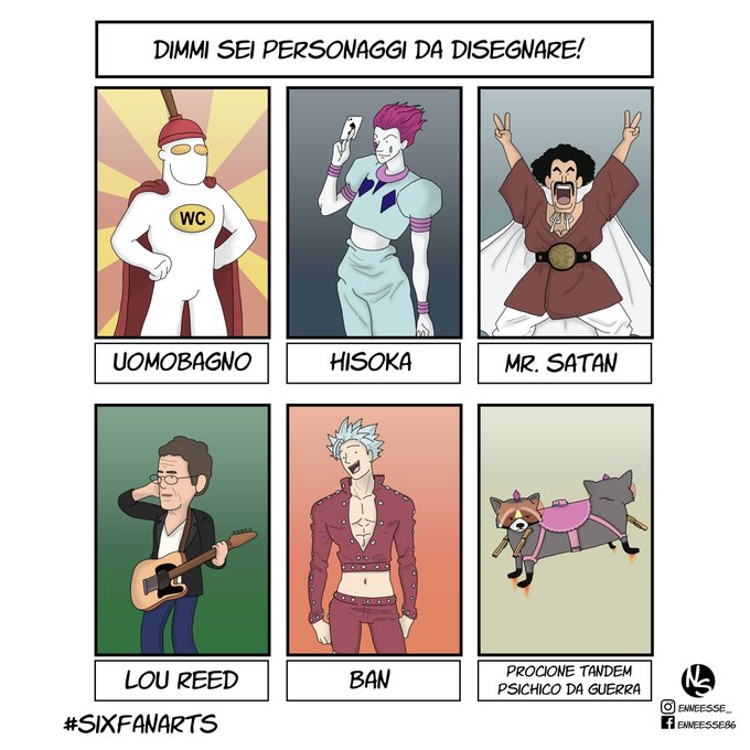 Ecco la mia prima #sixfanarts partita da Instagram, ne farò altre quindi seguitemi sul mio profilo per partecipare. Intanto grazie ai primi sei! #uomobagno #hisoka #mrsatan #loureed #ban #adventuretime #challenge #characters #inmyownstyle #enneesse #vignette