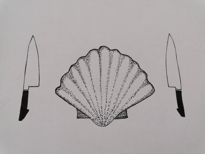 Día 4: #Scallop Cuando escucho la palabra vieira solo se me viene una cosa a la mente... ¡Iron chef! "con el corazón abierto y el estómago vacío, les digo, con las palabras de mi tío: Allez Cuisine!" #inktober2022