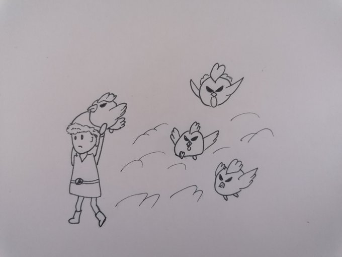 Día 16: #Fowl Me da miedo decir que soy fan de zelda pq he jugado como 2 ó 3 juegos, pero molestar a las gallinas y huir de su ataque es de lo mejor; por cierto, estoy esperando que salga el proximo. #Inktober2022