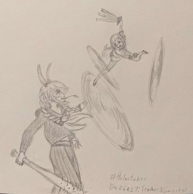 #HOLOctober Days 26 & 27, Teacher Shion and Delinquent Pekora, that's close enough to gangster right? Pose inspired by Higurashi Rei, surprisingly enough. #ぺこらーと #シオンの書物