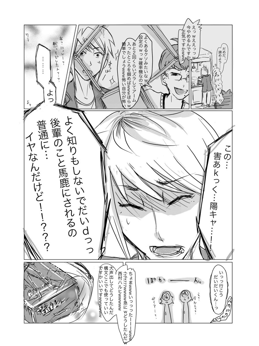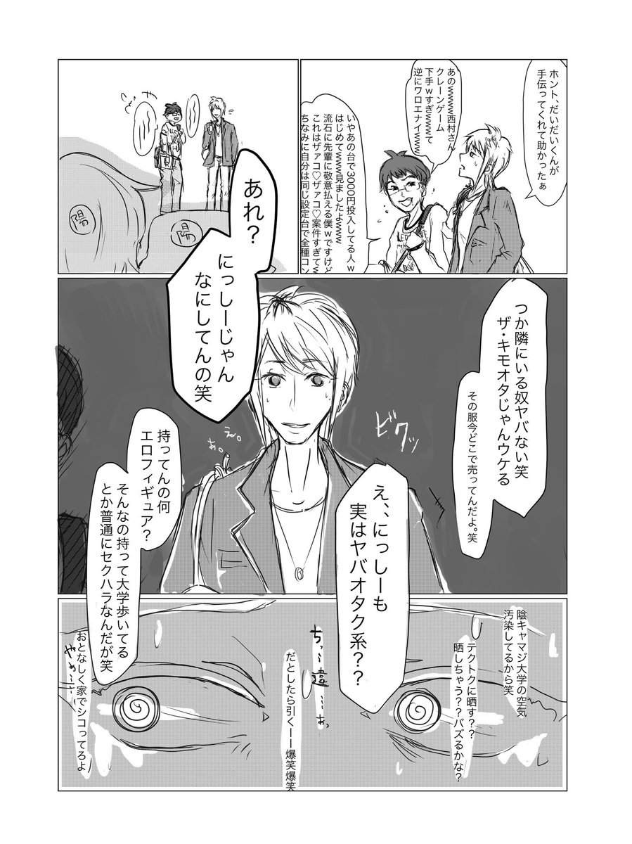 だいだいくんと西村くんがゲーセンに行く仲になってて、西村くんが叡ゲ同に影響されつつも少し自己主張できるようになってたらいいなって思って描いた漫画です。 #陰ラブFA